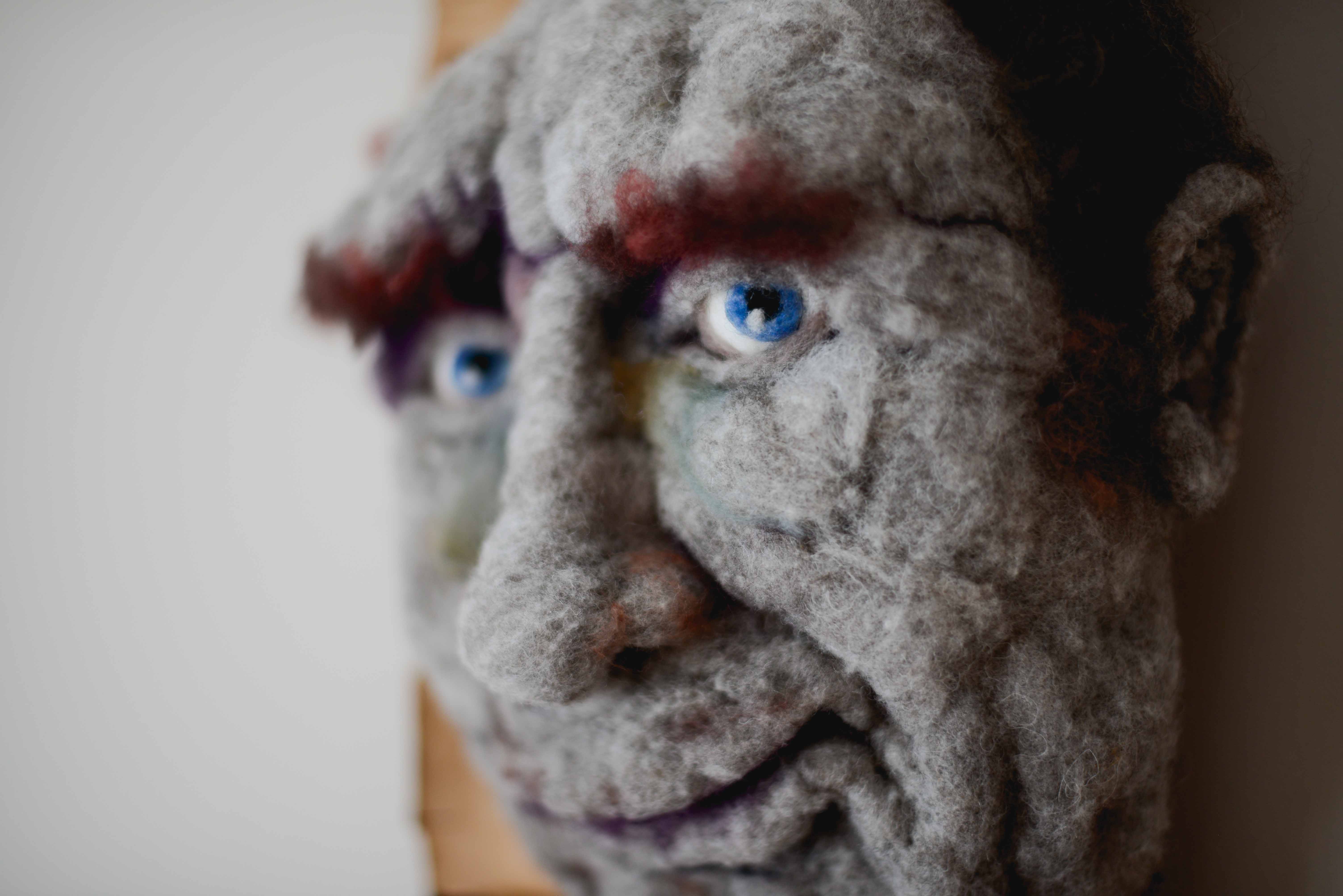 Hugo_detail Published March 2, 2017 at 6016 × 4016 Title: Hugo (Rosemarie Péloquin) Hugo – Hand needle-felted wool sculpture of a male face – baldish with a slight grin. Mounted on reclaimed birch bark. artist: Rosemarie Péloquin; photo: Emily Christie.