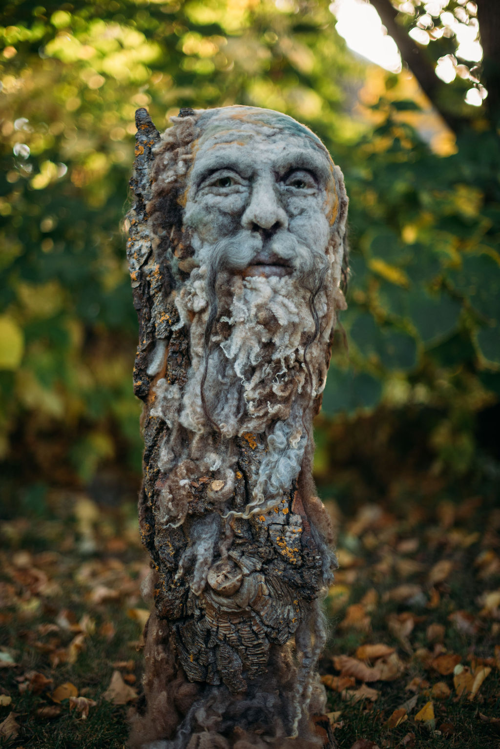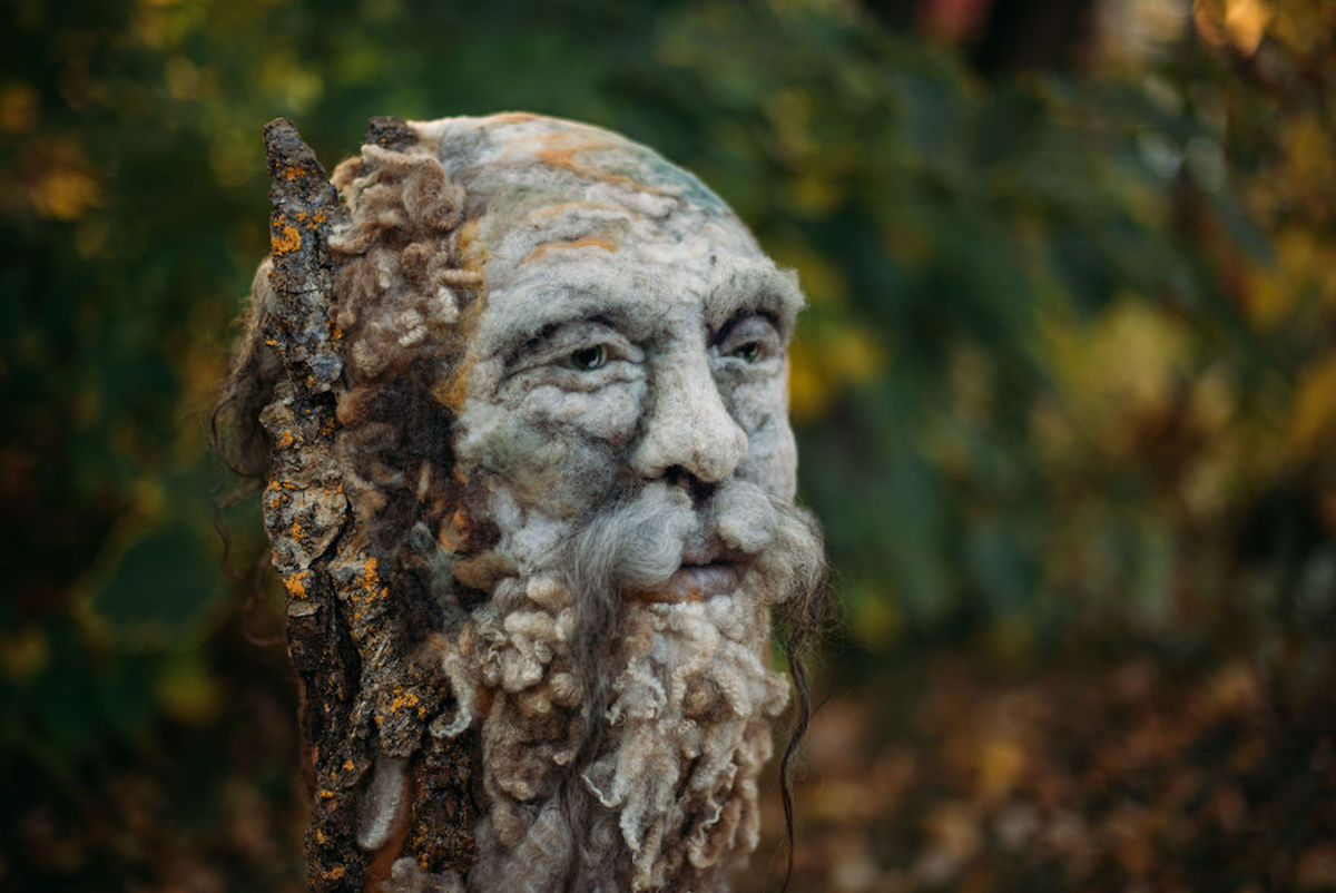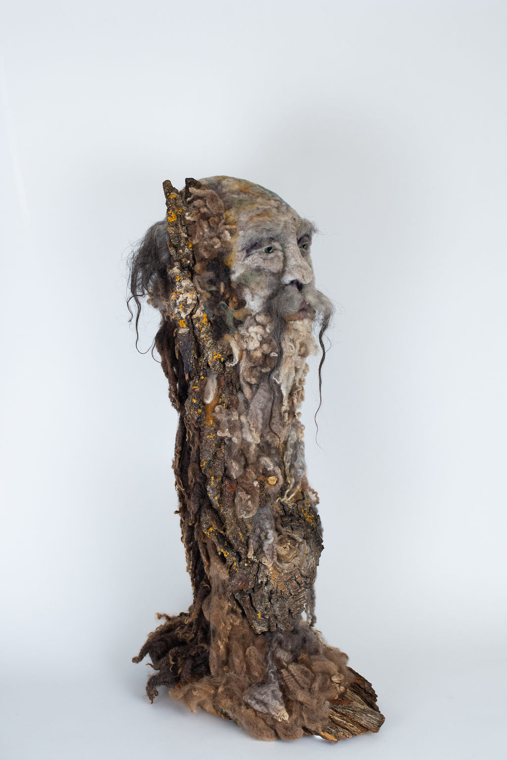 The head is hand needle-felted wool around a slab of wood bark. Roving and locks from five different heritage breeds of sheep were used in the making. With her tiny barbed wands she teases the natural fibres, encouraging the spirits within to migrate from wood to wool to maker’s hand.